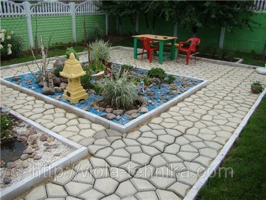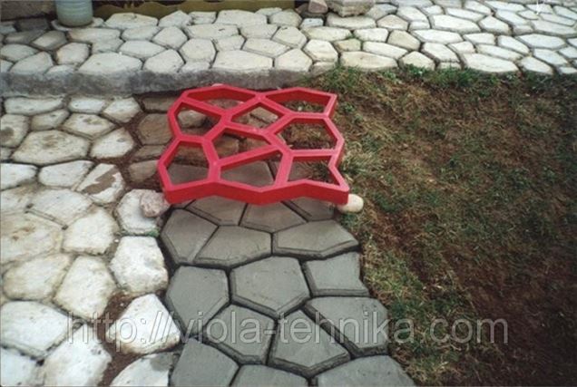 Производство плитки с формой для садовой дорожки состоит из нескольких этапов. Для начала необходимо определить место для вашей дорожки и подготовить поверхность, на которой будет размещена (бортиками вверх!) форма. Далее следует этап непосредственного создания плитки – форма равномерно заливается цементом, для схватывания которого необходимо будет дать форме просохнуть около часа. Для того, чтобы цемент был более однородным, и с ним было удобнее работать, в смесь лучше добавить пластификатор. Если такового под рукой не найдется, хорошей заменой станет небольшое количество шампуня. С целью немного разнообразить дорожки цемент можно сделать цветным, украсить его щебнем, декоративным песком или битыми разноцветными стеклами. После высыхания цемента форма аккуратно снимается и переставляется дальше, а на ее месте появляется девять камней, прекрасно имитирующих природную породу.