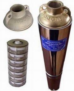 Насос центробежный погружной БЦПЭ Водолей Евро-1 Многоступенчатый центробежный погружной электронасос БЦПЭ «Водолей» применяется для подачи воды для быта с минимальным диаметром скважины в 110 мм. и более а также использется при подаче воды из колодцев, резервуаров и открытых водоемов для полива. Рекомендуем применять насос Водолей Евро-1 для воды не превышающей 35°С. Запрещается перекача загрязненных, щелочных, кислотных жидкостей и растворов. В воде не допускается содержания большого количества песка или иных видимых механических примесей и иметь минерализацию более 1500 г/м3. Экплуатционный срок погружного насоса Водолей Евро-1 – не менее 10 лет, средняя наработка на отказ – 10 000 часов. Состоит насос из однофазного электродвигателя переменного тока и многоступенчатой насосной части, выполненных в виде моноблока, а также выносной конденсаторной коробки, закрепленной на шнуре питания с вилкой.