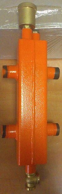 Гидравлическая стрелка предназначена для разделения нескольких гидравлических контуров с исключением воздействия их друг на друга и обеспечения разницы температур в подающем и обратном трубопроводе не выше 45˚С. Используются гидравлические разделители для обеспечения оптимальной работы котельного оборудования и режимов работы потребителей