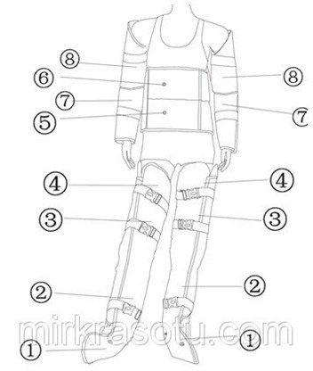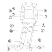 - 16-ти канальный костюм, отдельные сектора для ног — по 4 на секции на каждой ноге, рук- по 2 секции на каждой руке, и поясничной области- 2 секции (поясница, живот).
