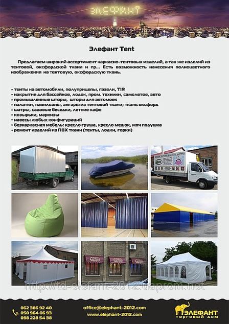 Предлагаем широкий ассортимент каркасно-тентовых изделий, а так же изделий из тентовой, оксфордской ткани и пр... Есть возможность нанесения полноцветного изображения на тентовую, оксфордскую ткань.