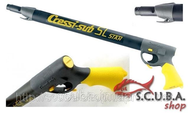 Дизайн и материал рукоятки можно назвать фирменной чертой всех ружей фирмы Cressi: удобная анатомическая форма рукоятки и нескользящая резинопластиковая накладка желтого цвета. Пневматические ружья серии SL Star завоевали всемирную славу благодаря своей прочности, надежности, точности и мощности выстрела. Удобная анатомическая форма рукоятки дает возможность держать ружье на одной линии с рукой без лишних усилий. Накладка на рукоятку ярко-желтого цвета позволяет легко найти оставленное на дне ружье. Прочный крючок для крепления линя расположен на заднем зацепе гарпуна (хвостовике).