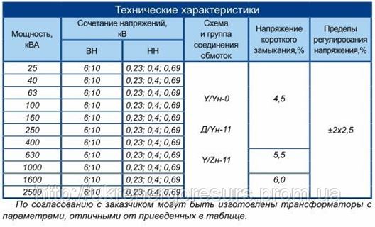 Характеристики трансформатора масляного силового ТМ-250/10 или 6 /0,4
